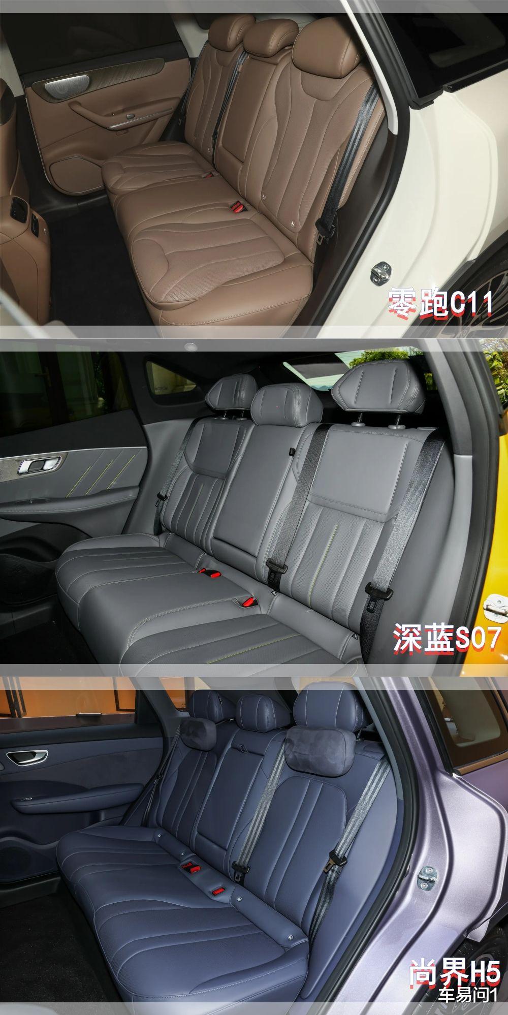 家用SUV,空间和乘坐舒适性是重点。从尺寸来看,三台车的车长都介于4米7到4米8之间,相差并不大,但零跑C11的轴距做到了2930mm,略大于深蓝S07的2900mm,也要比尚界H5的2840mm长不少。基于更长的轴距,零跑C11也就拥有了更大的轴长比,在内部空间的利用上,零跑C11理论上会更好。所以,相对来说,零跑C11的内部空间会更大一些,而深蓝S07和尚界H5其实也够用。像咱们日常载着家人出行,即便是满载五人,后排的乘客也不会拥挤,包括咱们安装了儿童座椅之后,后排也依旧能坐下两个成年人。