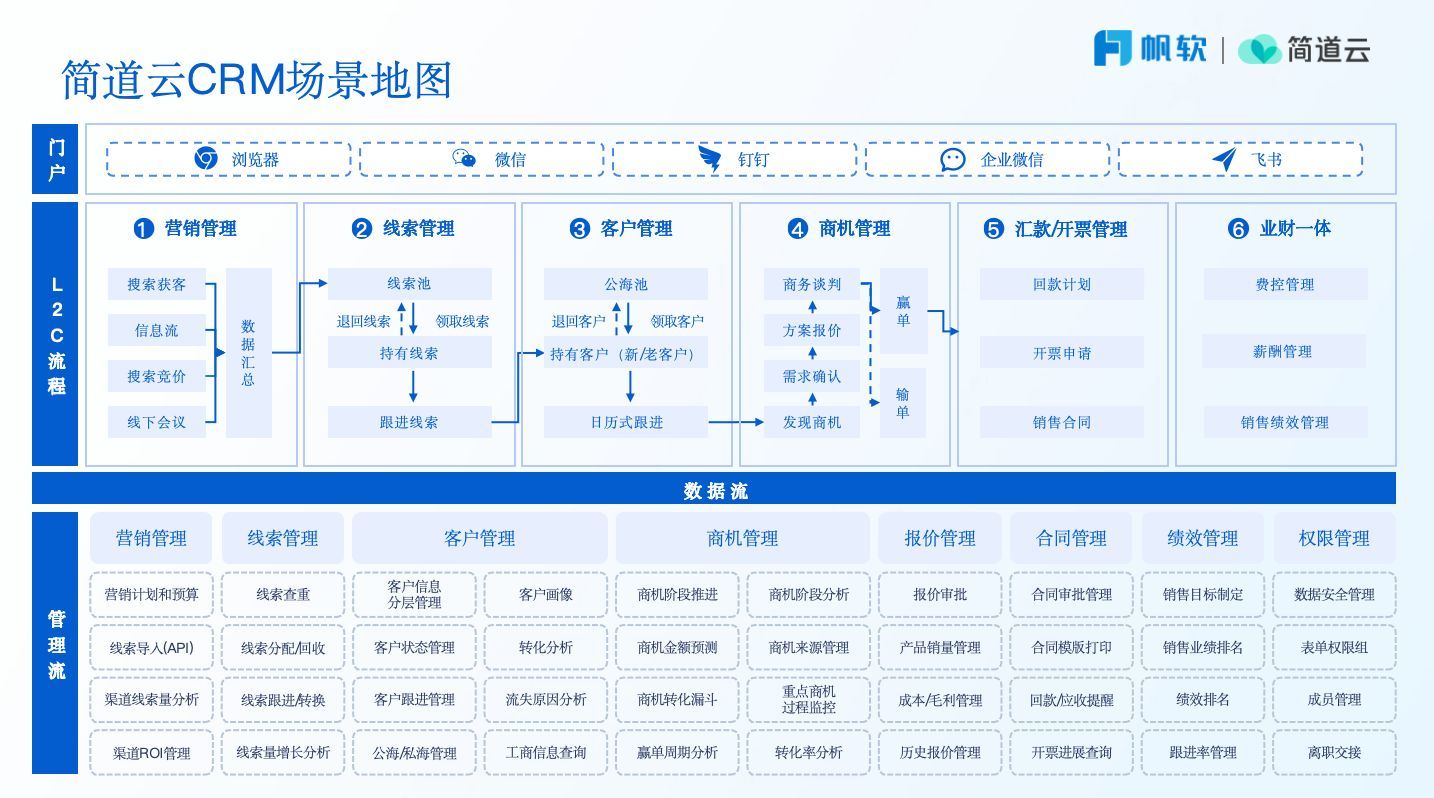 因为 CRM 是一个数字化工具,通过搭建出各个场景的表单应用,以及特殊功能的串联,可以帮助企业将散落在业务中纸质的、不能检索和统计的数据进行处理,变成可检索可统计的有效数据流,进行高效应用和协同共享。基层员工、中高层管理者均可以配置不同的数据权限,让数据在不同人员/部门之间流转起来,实现线索、客户、跟进记录、商机、报价、合同、收付款、绩效等环节的数据一体化管理。结合简道云强大的数据分析能力,帮助企业进行深度、多维的经营分析,成为管理业务和制定决策的重要依据。从而实现业务的管理流,以提升企业的业务效率,反哺企业增长。
