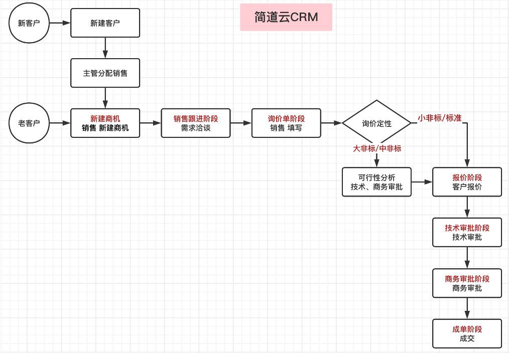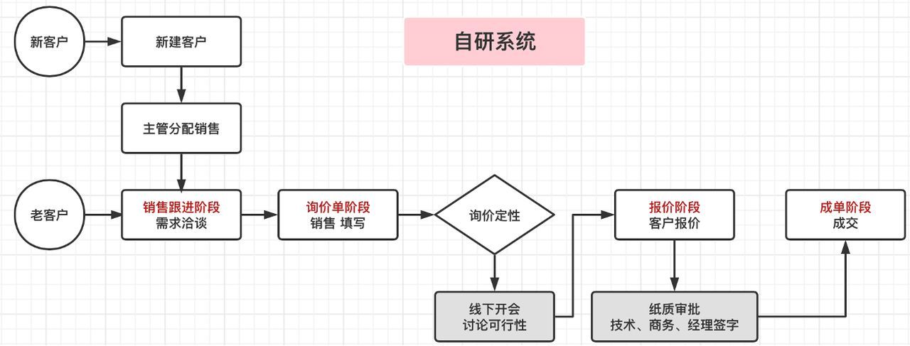 用简道云 CRM 前他们用的是自研的 CRM 系统,大体的流程是:销售对新老客户进行跟进,有意向客户进行方案询价,确认方案后进行报价,那么由于项目型企业需要控制各个节点方案的正确性、毛利等等,需要进行技术、商务、总经理审批;而由于自定义流程能力的缺失,审批环节还是用线下纸质审批,审批完把结果再录入系统,这个环节平均耗时 3 天。