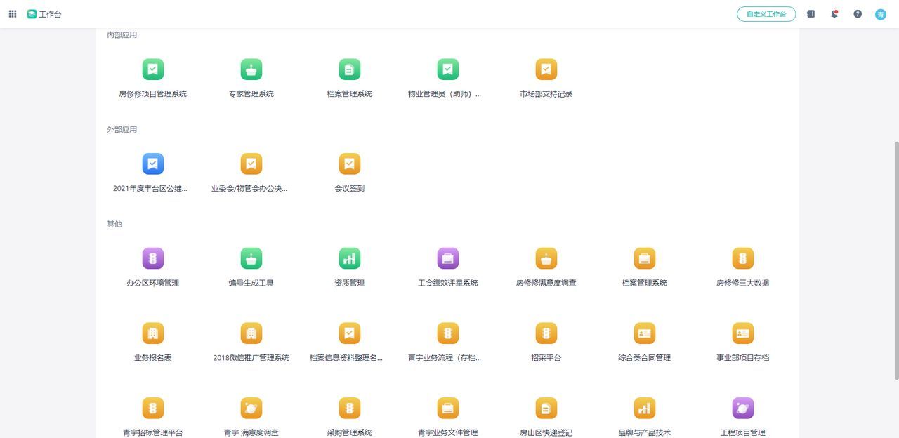 其中包括:CRM、专家管理、存档管理、财务报销、行政管理、日常 OA 办公、项目用印审批等场景应用。