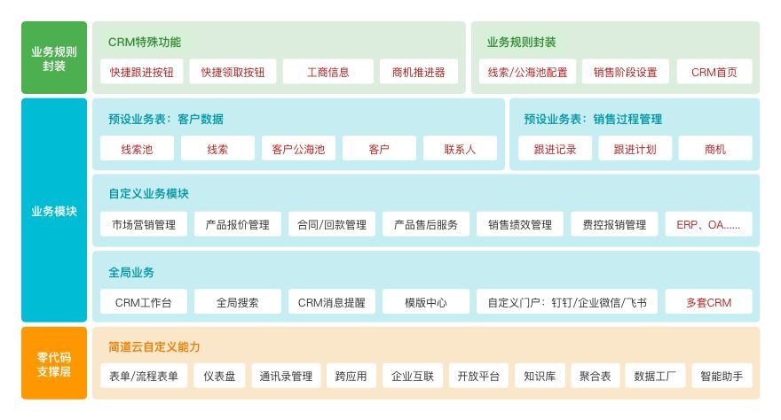 简道云 CRM:是基于简道云的自定义能力,通过封装部分 CRM 场景的特殊业务逻辑,加上特殊开发的 CRM 场景独有的产品功能,而诞生的一款拥有强大自定义能力的专业零代码 CRM 应用;