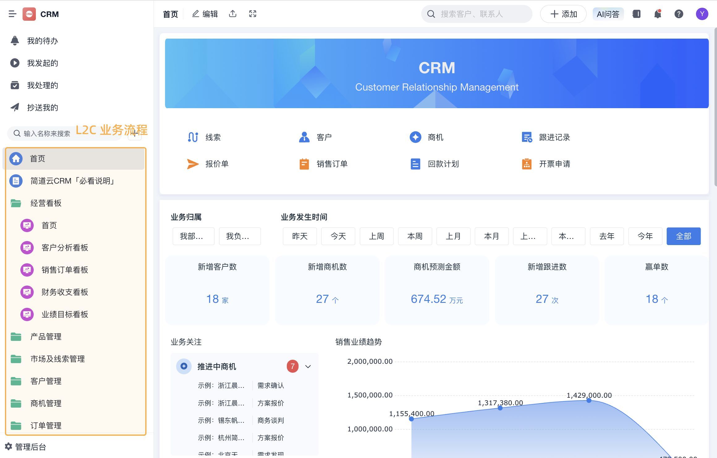 2)简道云 CRM 模板的业务流程逻辑:L2C