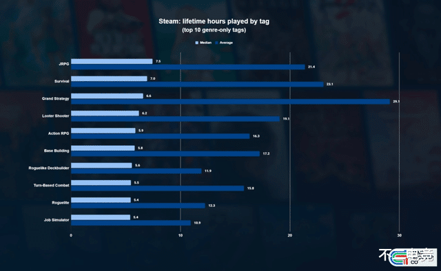 这份数据最让人意外的,莫过于JRPG的高时长,毕竟JRPG经常被认为跟不上时代,玩法落后,但铁一般的事实表明,JRPG仍然拥有众多受众,其独特的魅力依旧吸引着为数众多的玩家投入大量时间。