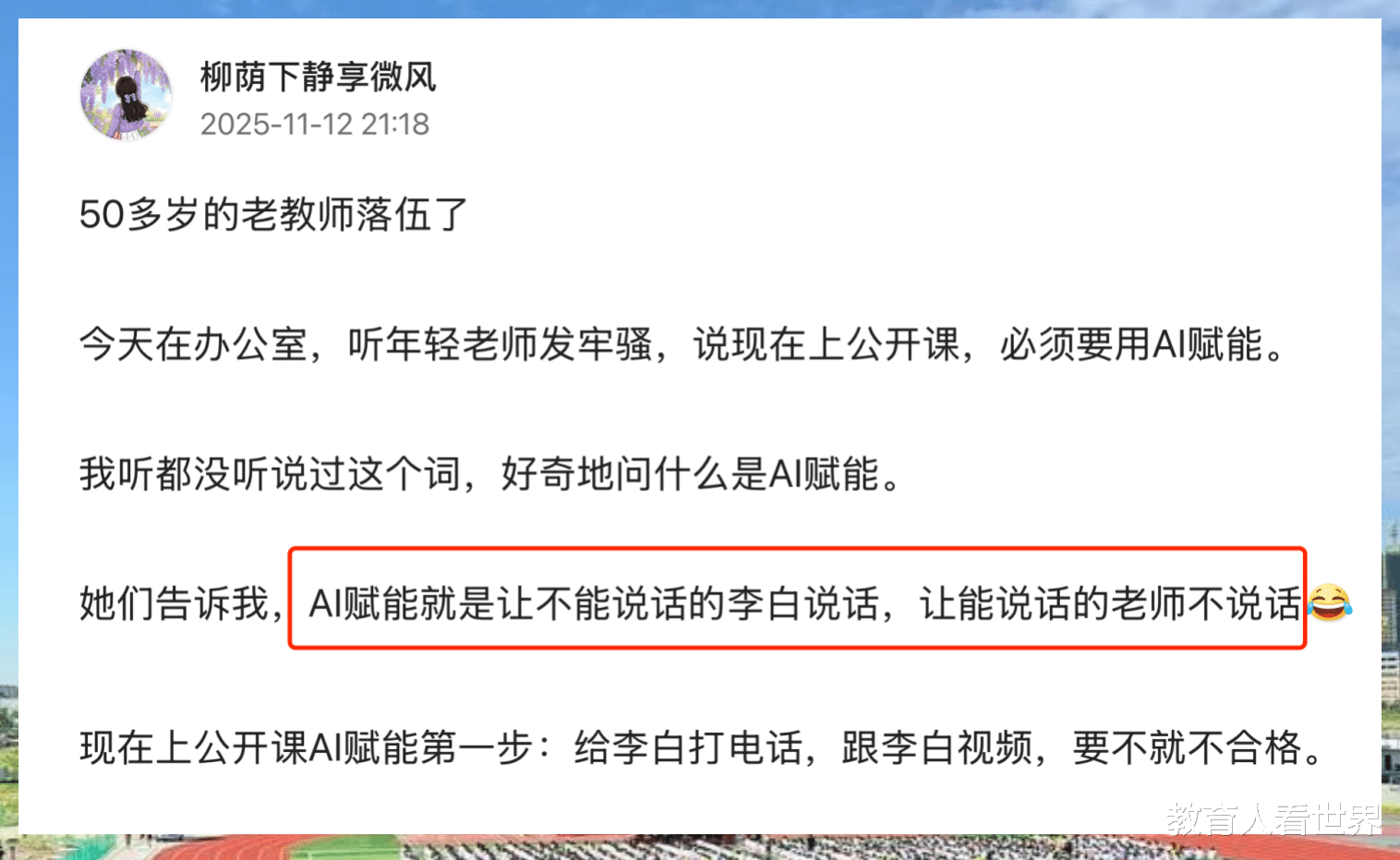 这位老教师的困惑,仿佛一面镜子,映照出当下教育变革洪流中,一部分沉默者的真实心态。他的牢骚,或许显得有些守旧,甚至不合时宜,但那份对学生学业实实在在的关切,以及对教育本真的朴素理解,却透着一种历经岁月打磨后的温度。在这个言必称“赋能”、行必效“跨界”的时代,他那句“只会拿着粉笔讲”的自白,反倒成了一种独特的姿态。