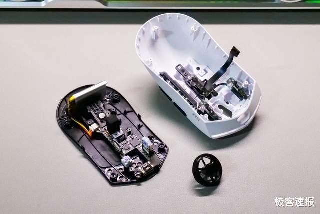 将VT7 MAX拆开后会发现,其实脚垫下面是镂空的,鼠标不含脚垫重量仅为53g,也是彻底贯彻了轻量化理念。鼠标内部的集成化非常高,并且PCB板的面积也缩减到了极致,除了更加轻量化,也减少了触电与接线,也就同时减少了触控不良情况。