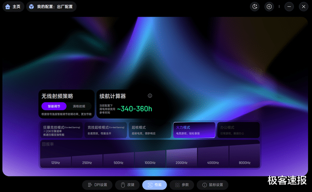 除了对具体性能进行自定义,驱动还可以根据不同模式设置性能模式以及回报率档位,比如火力模式 1K 可连续使用约 500 小时、超核模式 8K 可连续使用约 100 小时,尤其MAX版的狂暴竞技模式能够开启≥20000FPS满帧扫描和原生8kHz回报率的性能,同时续航还能达到约75小时,电竞狂徒应该满意了吧!神奇的是驱动的配置文件能跟随应用切换,真正做到了性能与续航兼得。
