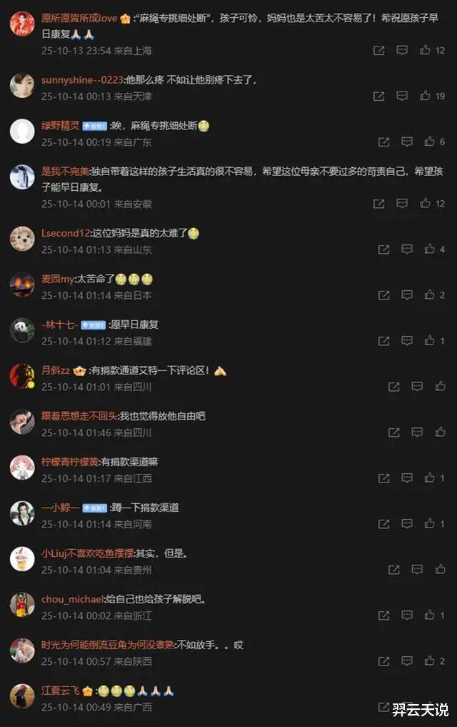 很多网友留言祝福孩子早日康复,也感慨“麻绳专挑细处断”,“这位妈妈真的太难了”;还有网友问“有没有捐款渠道”,纷纷表达了一份爱心。
