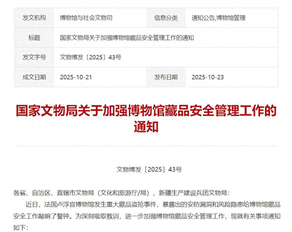 针对近日法国卢浮宫博物馆发生重大藏品盗抢事件,10月23日,国家文物局网站发布《国家文物局关于加强博物馆藏品安全管理工作的通知》(以下简称《通知》)。《通知》强调,在观众流量高峰时段,各博物馆要增加巡逻频次,重点关注展柜周边异常行为,及时制止观众的不安全行为。