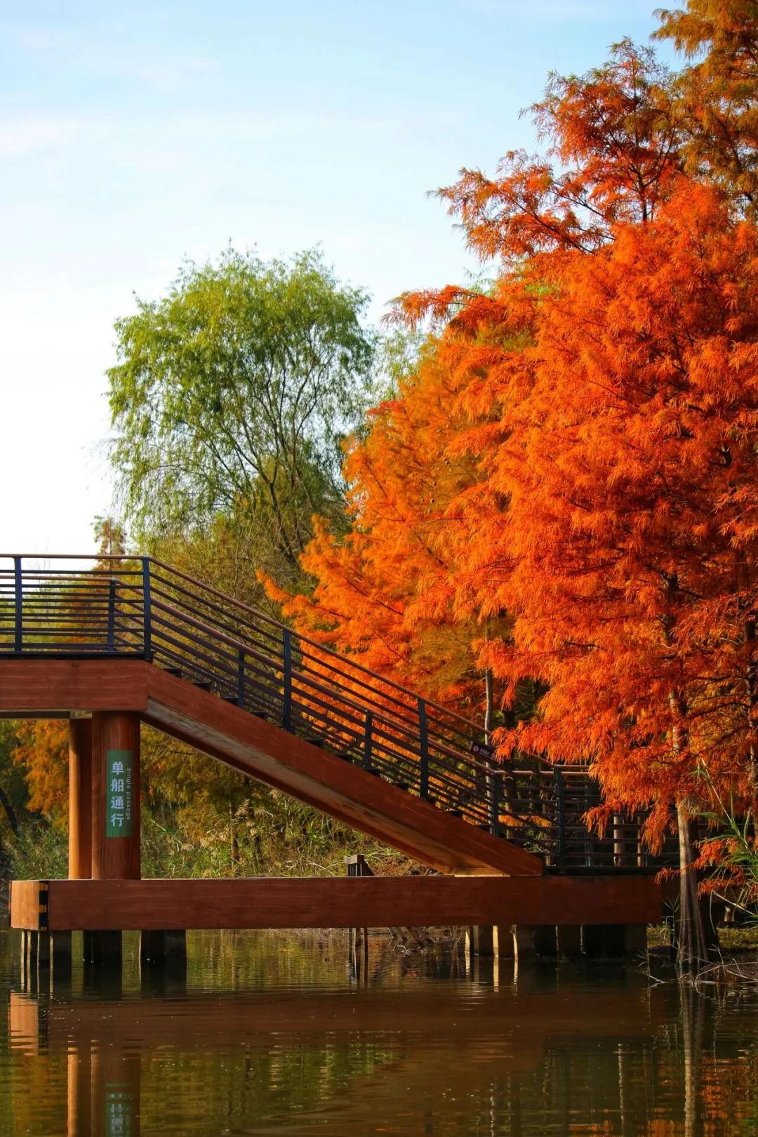 沿岸主要种植有落羽杉、池杉等植物。乘船缓缓驶入深处,可以看秋光层叠、红影婆娑,感受这个季节独有的温柔馈赠。