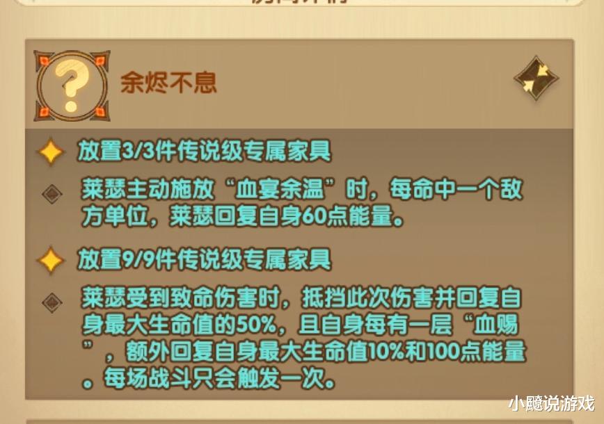 不过有两点要注意:一是 “渍印” 能被驱散,遇到高驱散阵容会有点难受;二是得养到位,专属至少 + 20、家具 9 件套才能发挥上限,低养成下强度会打折扣。但只要养起来,这疯批战士真的能抗能打能恶心人,不过,还是等大佬测试来知晓他的就业方向。