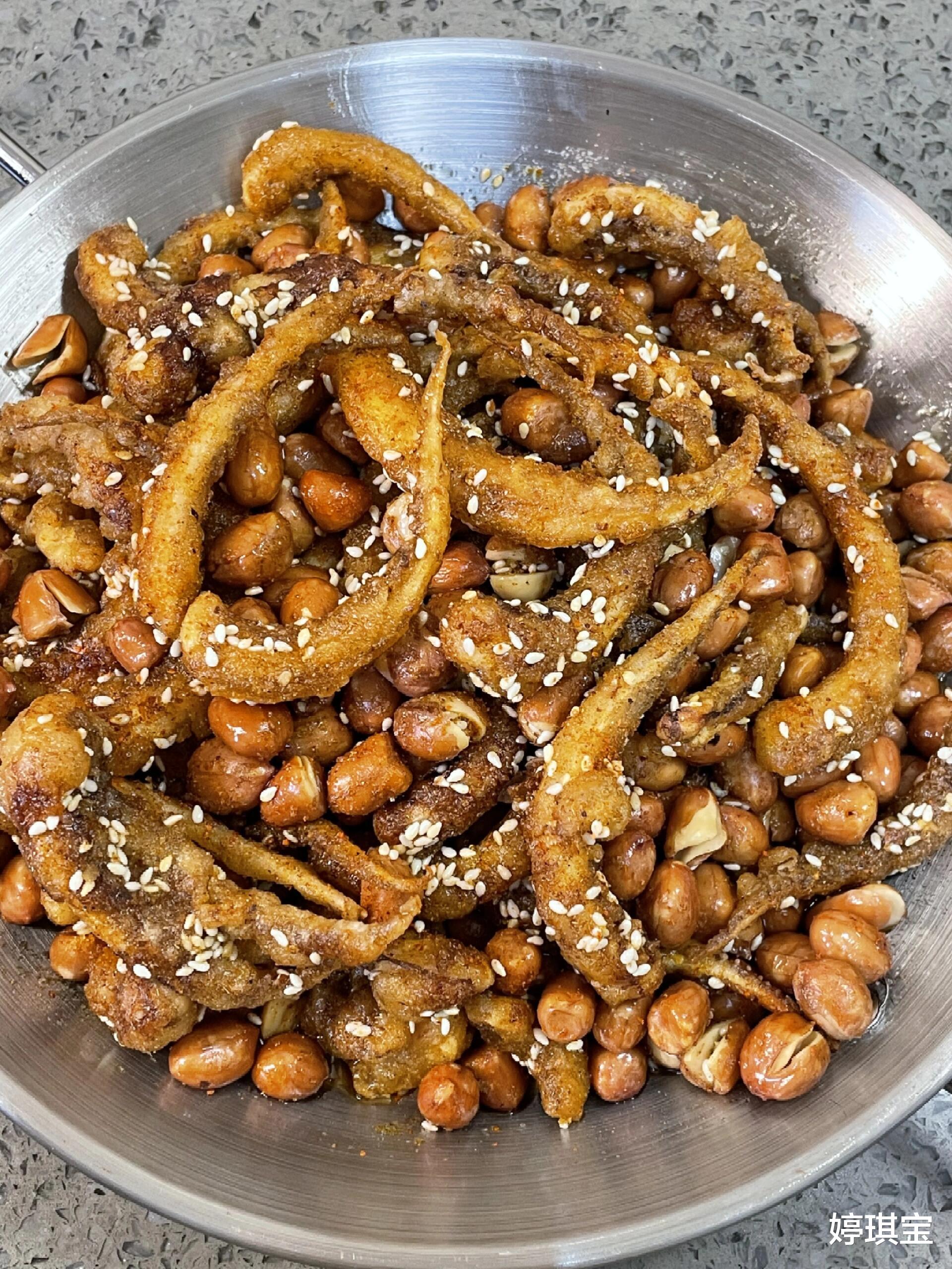 冷油下花生米,小火炸至微黄捞出。再用余油中火炸鱿鱼须,卷曲微焦即可。看!鱿鱼穿上金黄战甲,花生泛着油光~