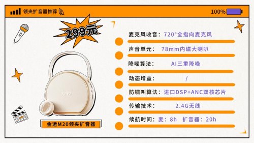 金运M20是一款适合教学、会议及户外导览使用的无线领夹扩音器。麦克风重量13.1g,扩音器223g,整体佩戴舒适,便于长时间使用。它采用磁吸式设计,搭载720°全指向麦克风和78mm内磁大喇叭,能够保证声音在中小型场景下清晰传输,人声还原度较好。