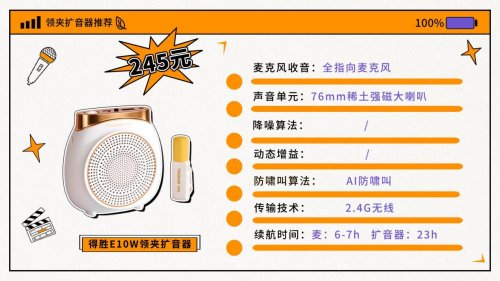 设备还支持3.5mm TRS接口及AUX输入,可外接其他音源,同时提供小音箱播放功能,方便灵活使用。可以看出来漫步者MF2它整体表现良好,适合日常扩音需求,是一款性价比和实用性兼顾的无线领夹扩音器。推荐三:得胜E10W无线领夹扩音器