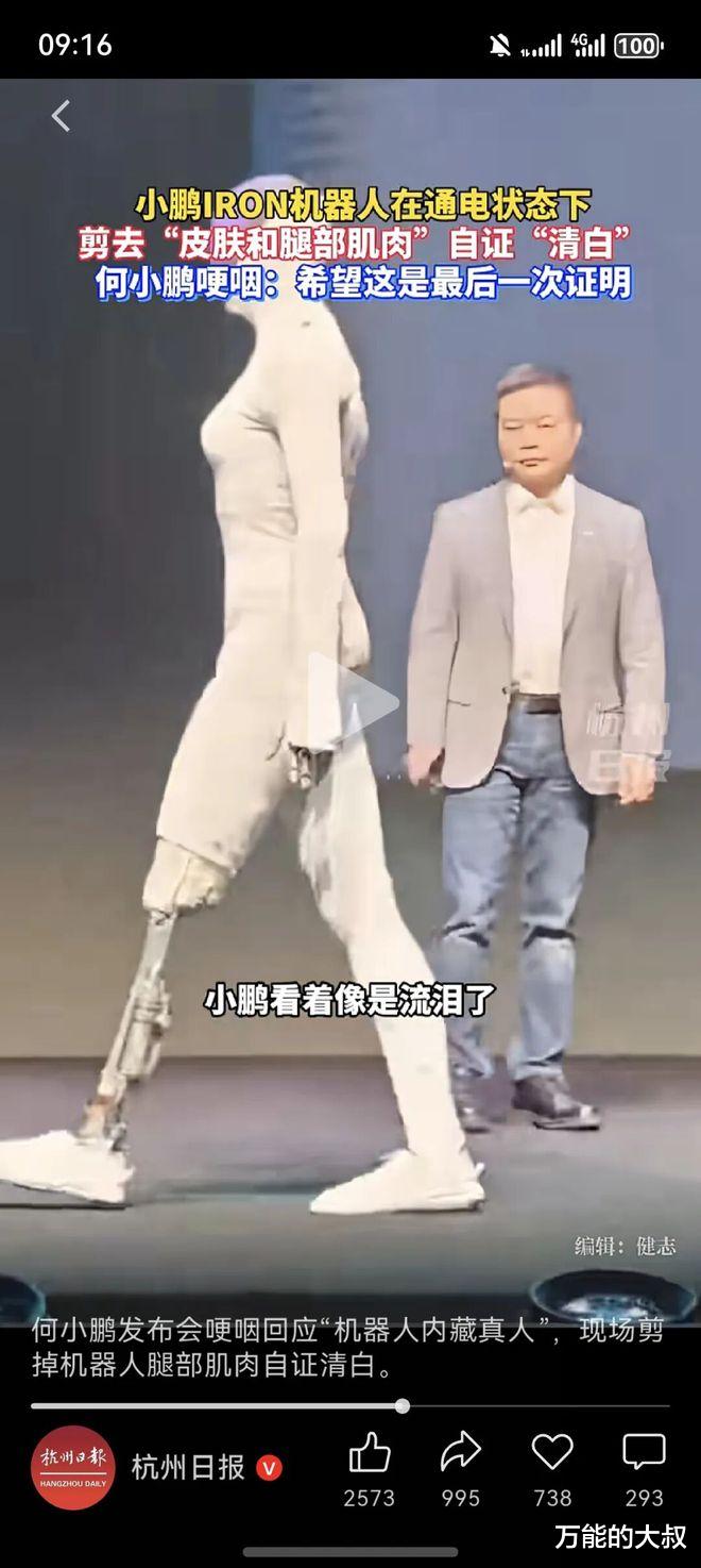 当剪刀划开覆盖件、露出内部机械结构的瞬间,现场一片寂静。看着褪去左腿肌肉和皮肤后的IRON依然迈着猫步走下台,何小鹏泪洒当场,哽咽道:“希望这是最后一次证明机器人是它自己。” 何小鹏的眼泪与决绝,映照出中国科技企业从追随者向引领者转型途中必须经历的阵痛。本来是一场前沿科技秀,却被大量网友质疑造假!董事长和团队一夜没睡,第二天上午马上回应!但依旧有人不信,怎么办?逼得第二天晚上再次回应,并一度哽咽。