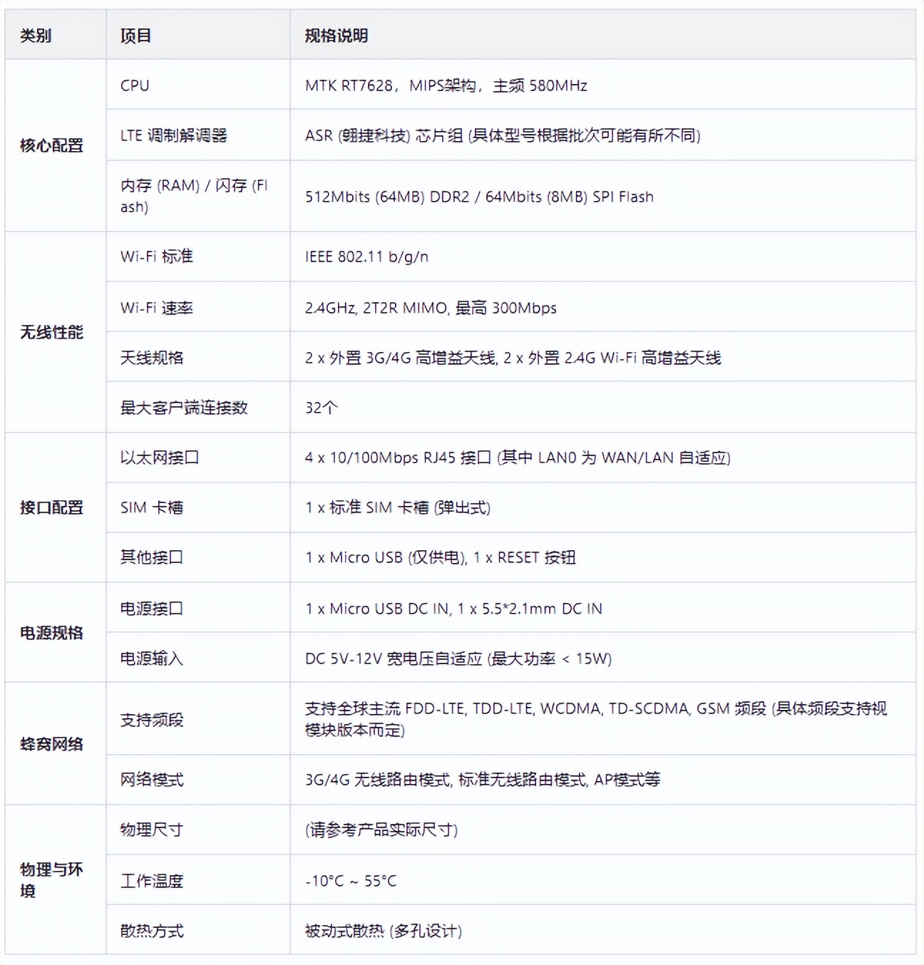 MC118路由器技术规格表下表清晰地列出了MC118高性能无线路由器的各项硬件参数,供您参考。