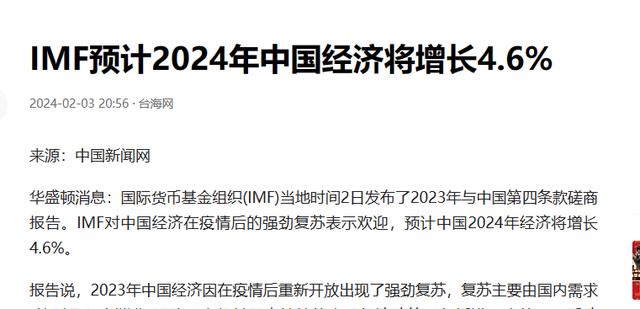 信息来源:《IMF预计2024年中国经济将增长4.6%》2024-2-3 台海网