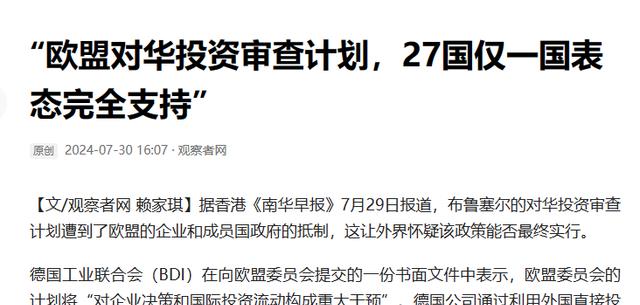 信息来源:《“欧盟对华投资审查计划,27国仅一国表态完全支持”》2024-7-30 观察者网