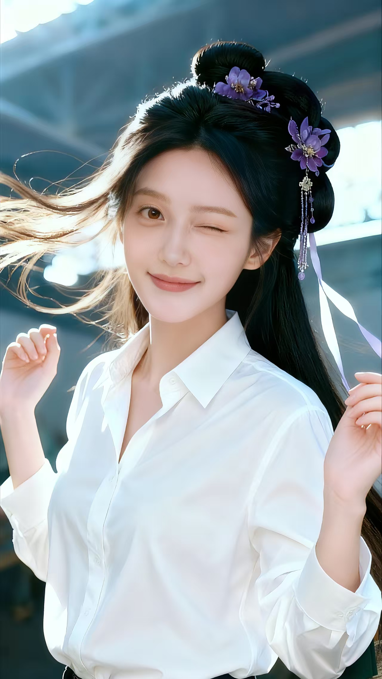 长发梳成高髻,点缀着精致的发簪与花朵发饰,几缕发丝自然垂落,增添了几分柔美。