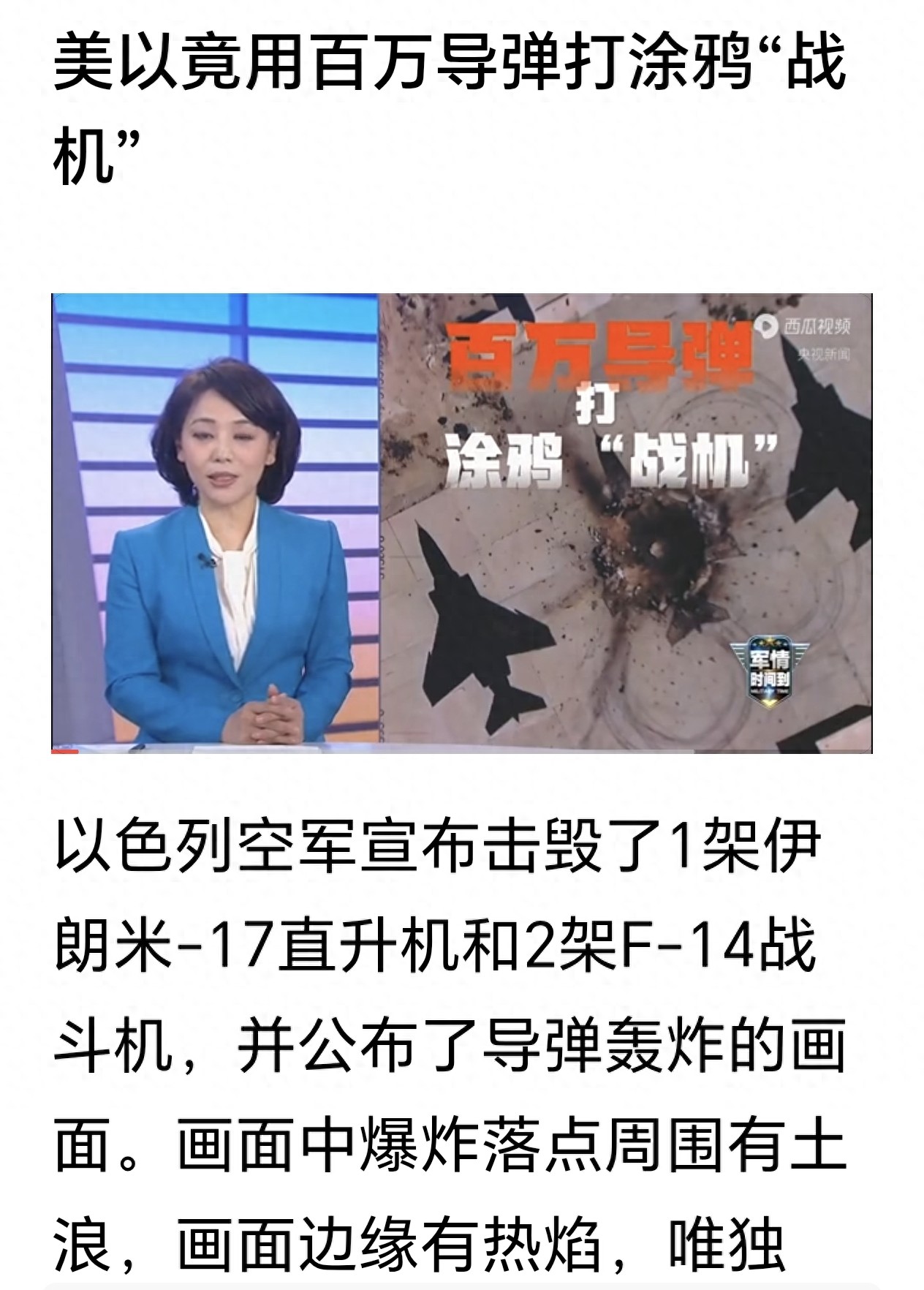 以色列空军对外宣布空袭成果,声称击毁伊朗一架米-17直升机与两架F-14战斗机,同步公布导弹轰炸画面。画面里爆炸落点扬起土浪,边缘显现热焰,被标注的目标始终保持静止。后续核实显示,这些目标只是水泥停机坪上的油漆绘制图案。