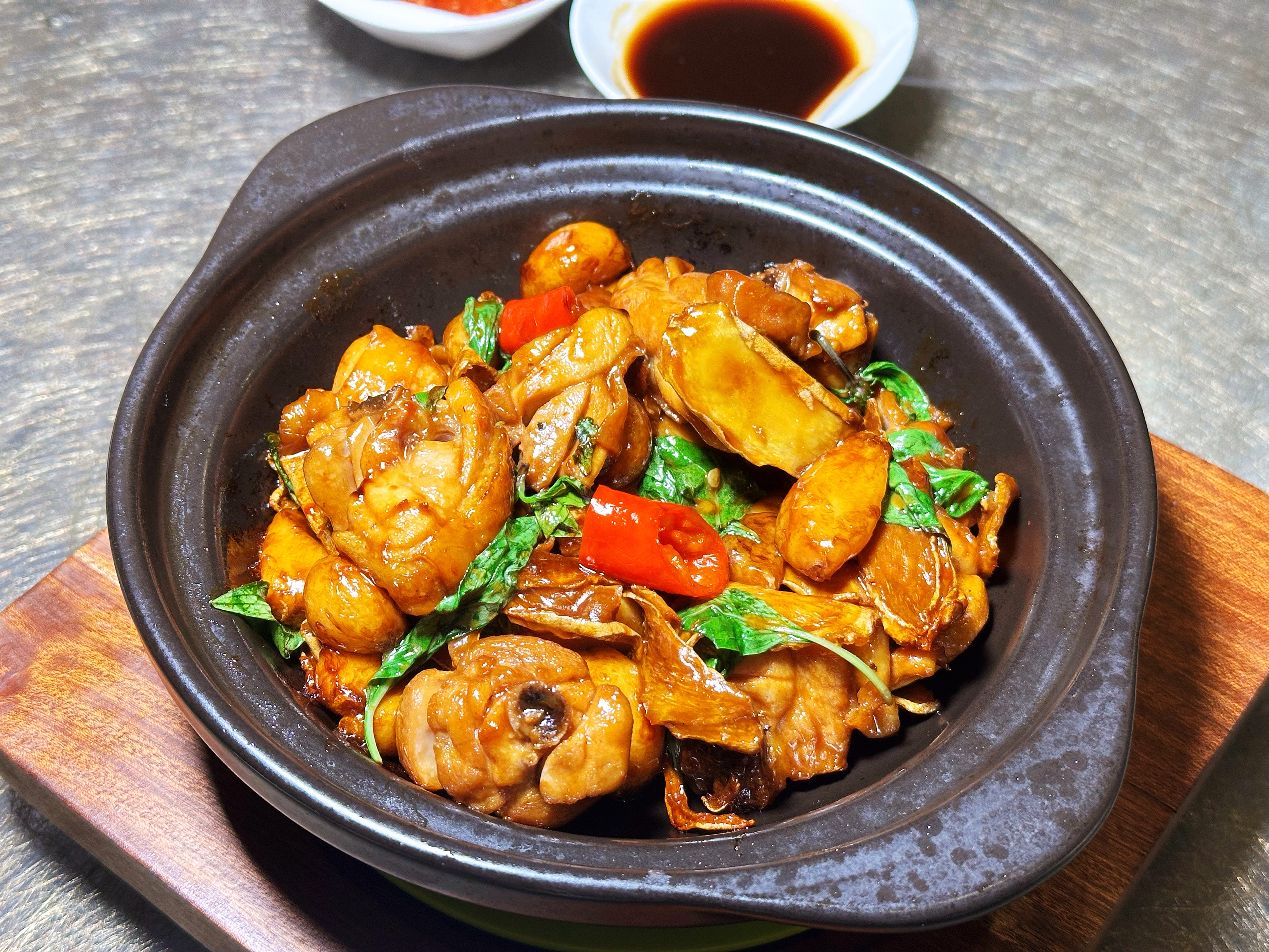 三杯鸡腿饭散发着浓郁的香气。三杯调料的独特配比加上罗勒叶提香,使得鸡腿鲜嫩入味,一口咬下去,满足感油然而生。
