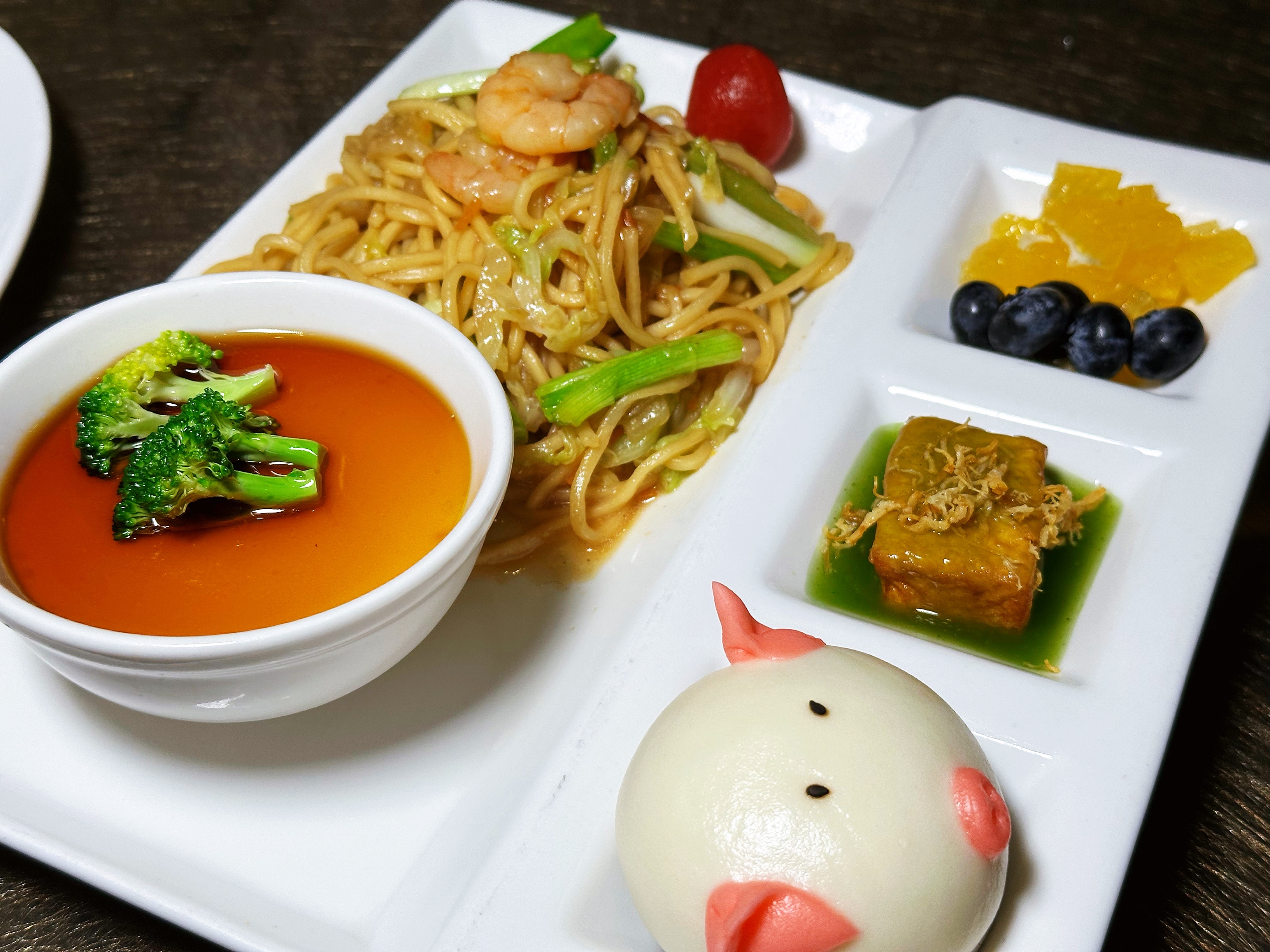 小宝宝的儿童套餐谁能拒绝。猪猪包、豆腐、鸡蛋羹、海鲜面还有水果。整个爱住啦。