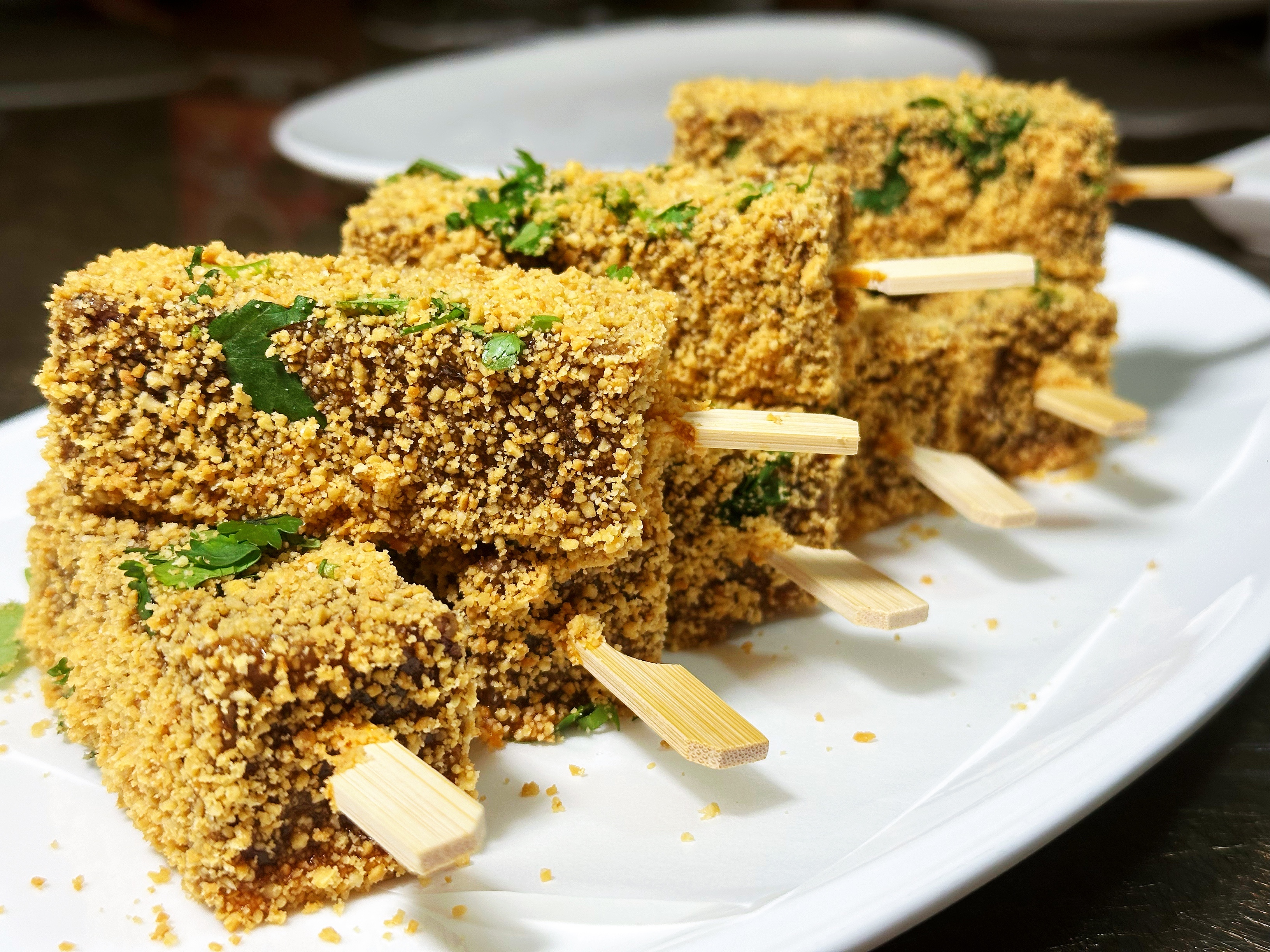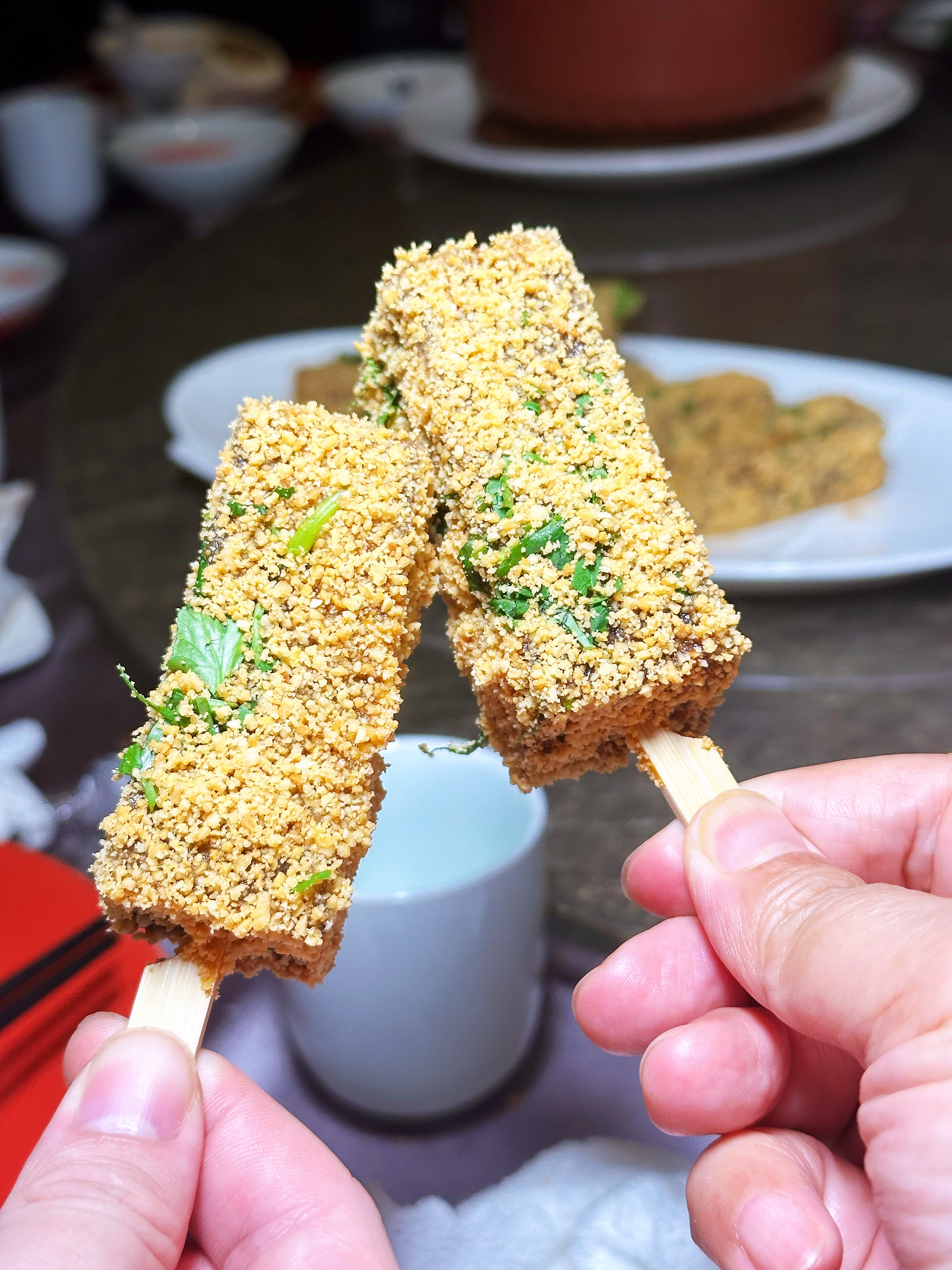 裹着厚厚花生粉碎和香菜的米血糕做成冰棒的形式,糯叽叽的,老夫的少女心啊~