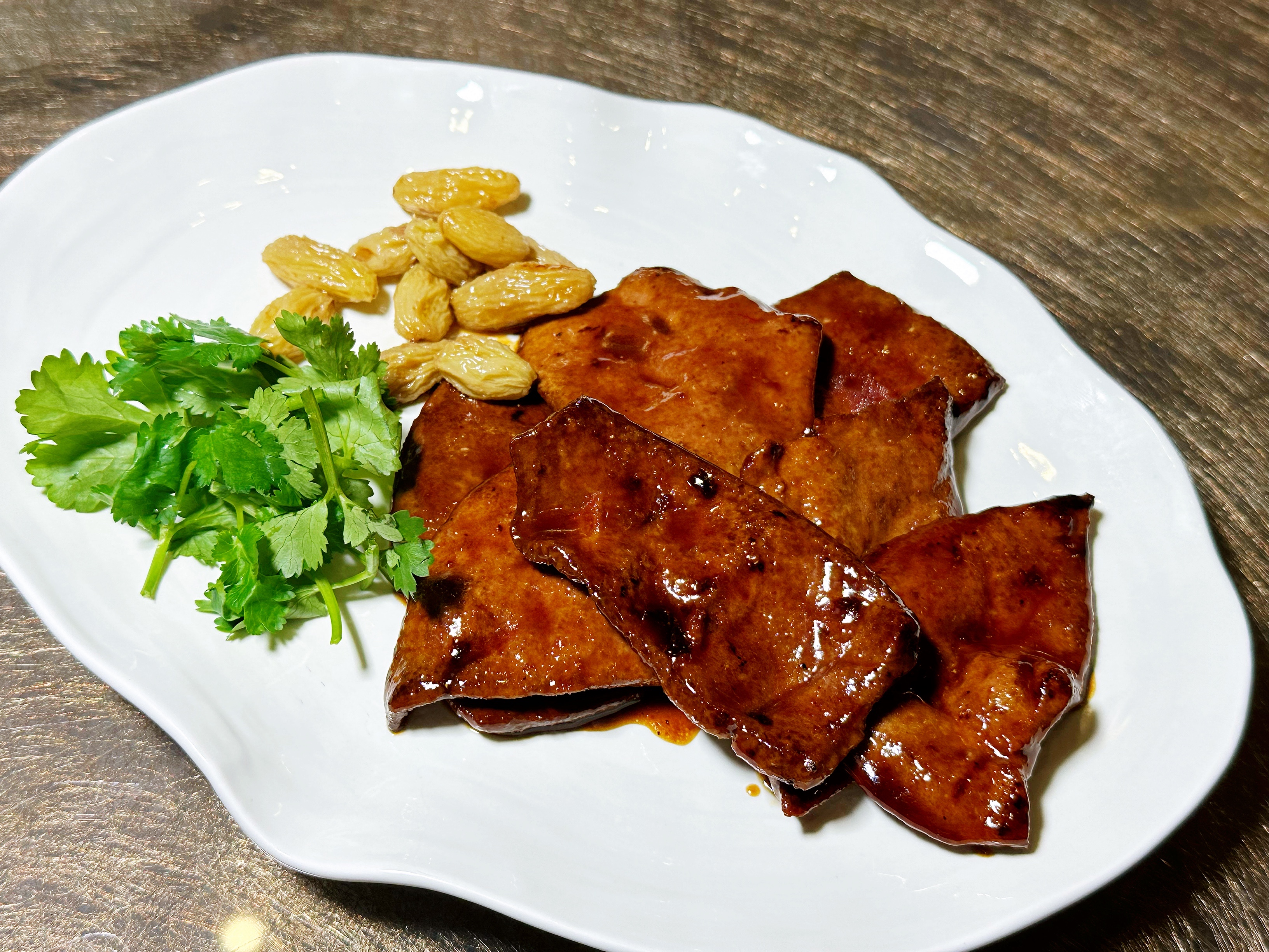 香煎猪肝搭配茶香白葡萄干中餐厅的招牌,几乎桌桌必点,猪肝爽口,白葡萄干带着茶香解腻。