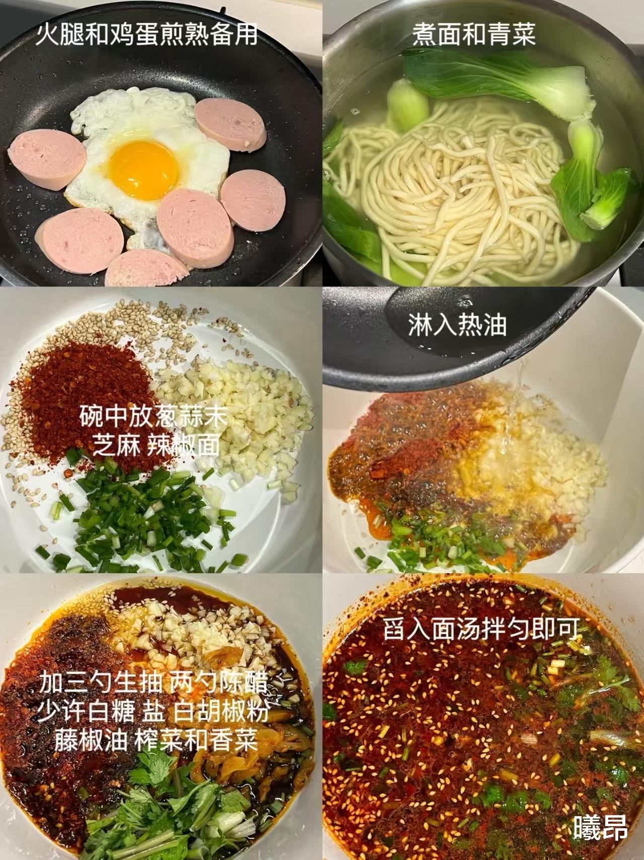 1. 备菜煮面:热锅放少许油,煎1个荷包蛋(或煎散),盛出后用余油煎香火腿条;另起锅烧水,水沸后煮面条,煮到8分熟时放入青菜,1分钟后一起捞出,过下凉水更筋道(可选)。