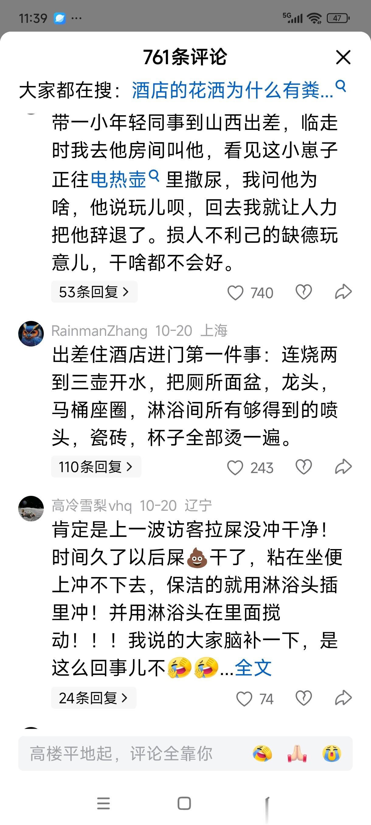 全季酒店花洒带有排泄物事件,影响越来越恶劣。很多网友积极留言说出了自己的看法和亲身经历,供大家参考。
