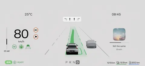 对比下来,部分豪华品牌仅能显示静态箭头或简单路线,在复杂路口容易让用户混淆转向时机;部分新势力车型虽尝试动态指引,但箭头颜色多为白色或红色,在强光下易反光模糊,而蓝绿色在各种光线环境下的辨识度更高,大大减少了视觉干扰,保障了整车安全。