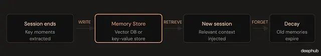 写入会话结束时,或进行中的关键节点,agent(或一个独立的记忆管理进程)判断哪些信息值得保留。判断起来并不简单,因为不能什么都存否则检索会变得缓慢且杂乱。需要保留的是那些后续可能有用的内容:做出的决定、表达的偏好、不容易重新推导的上下文。