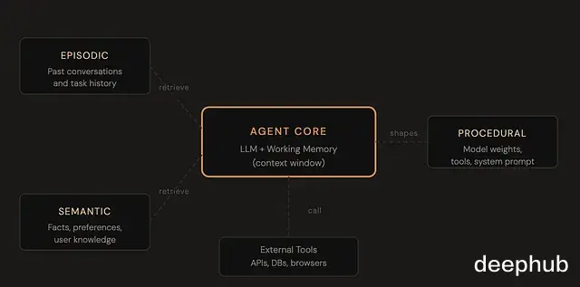 四种记忆类型映射到技术栈的不同组件上。工作记忆对应上下文窗口;情景记忆和语义记忆对应外部数据库(向量存储、关系型数据库、键值存储);程序记忆对应模型权重和系统提示词。