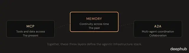 换个角度理解MCP 处理当下,此刻能访问什么;A2A 处理协作,多个 agent 如何协调;记忆处理过去,从前次交互中留下了什么。