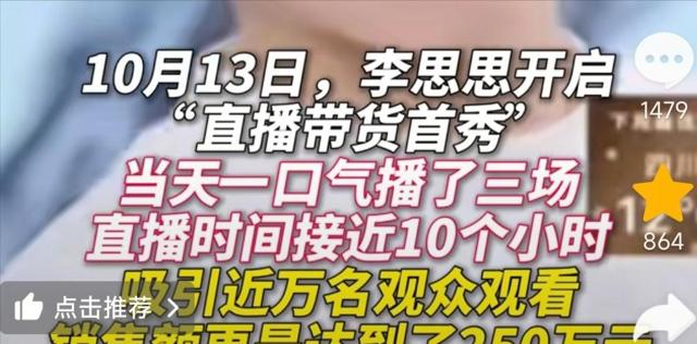 据相关消息报道,李思思第1场直播带货就带了三场,总计一共10多个小时,最终的销售额高达250多万。