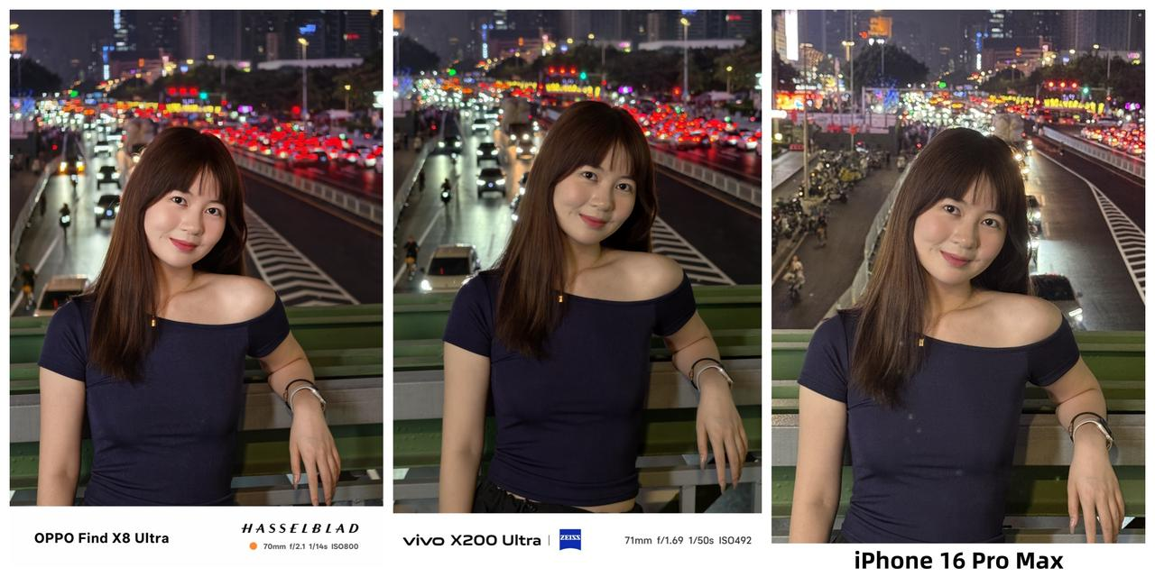 在实测中,iPhone 16 Pro Max的夜景人像模式在弱光下容易拍出「蜡黄脸」,且细节涂抹严重;vivo X200 Ultra的暗部肤色显得「灰暗」,缺乏生气。而Find X8 Ultra的成片既保留了红润自然的肤色,又精准还原了背景霓虹灯光的层次感,整体表现是三者中最好的。