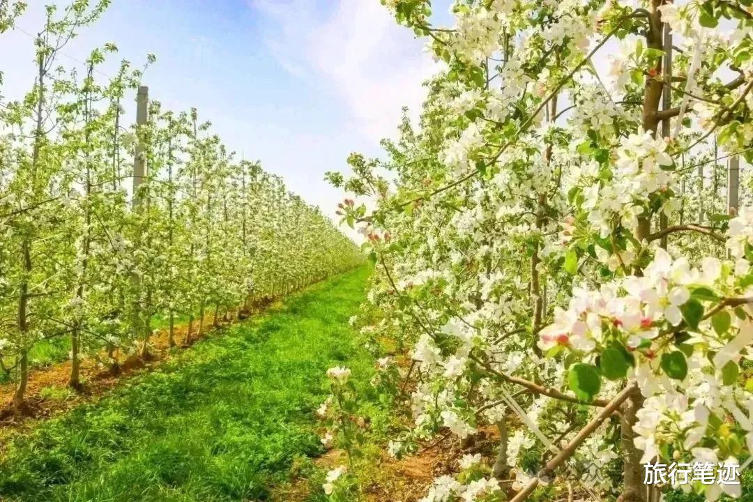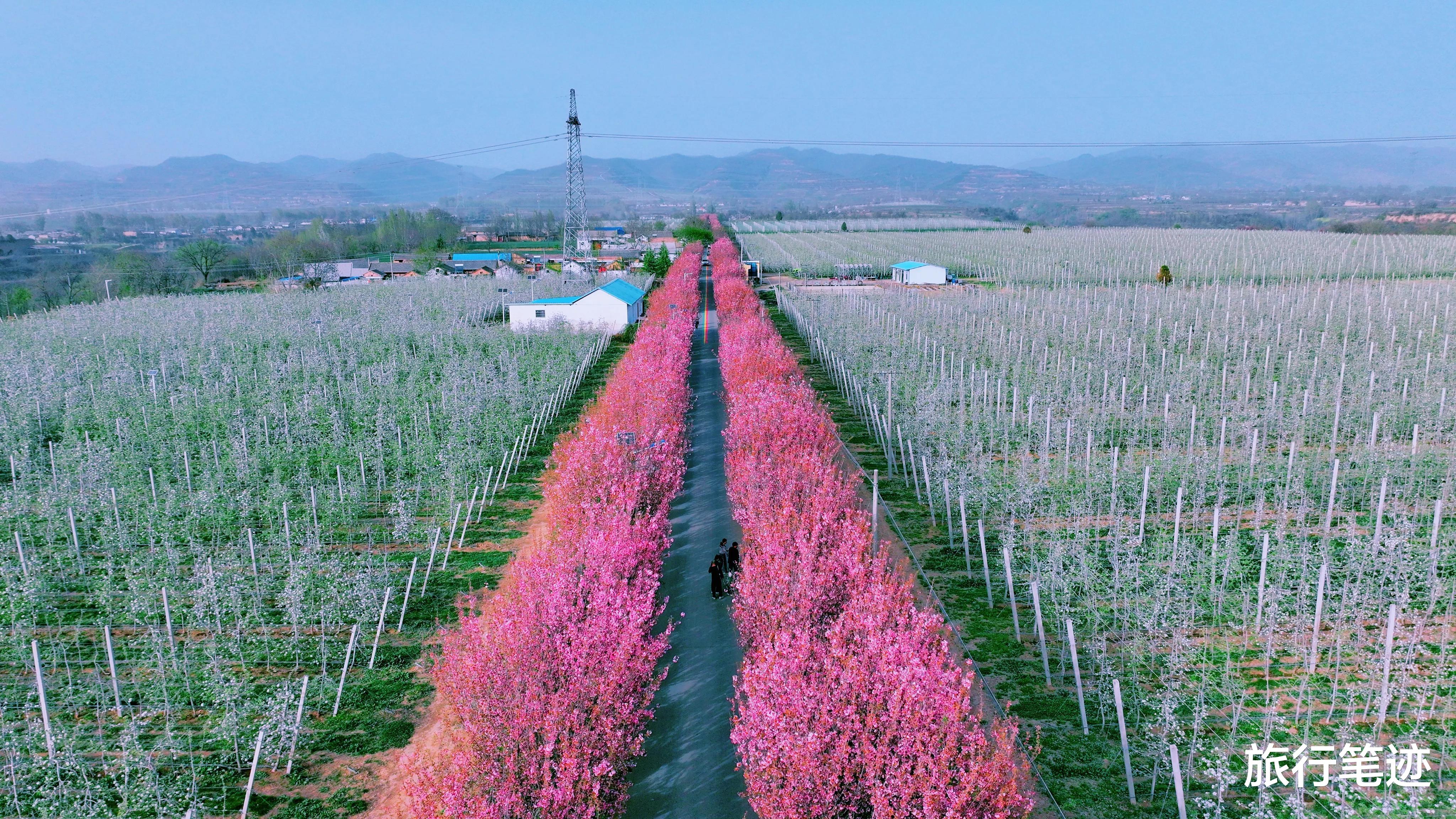 而在樱花大道从四面八方向外延展,均是一片片果园。全县十万亩苹果花正在盛放,远望如雪覆原野,近看则朵朵精致。花初开时粉红,盛放后转白,花心一点嫩黄,像是谁刻意点上的金粉。