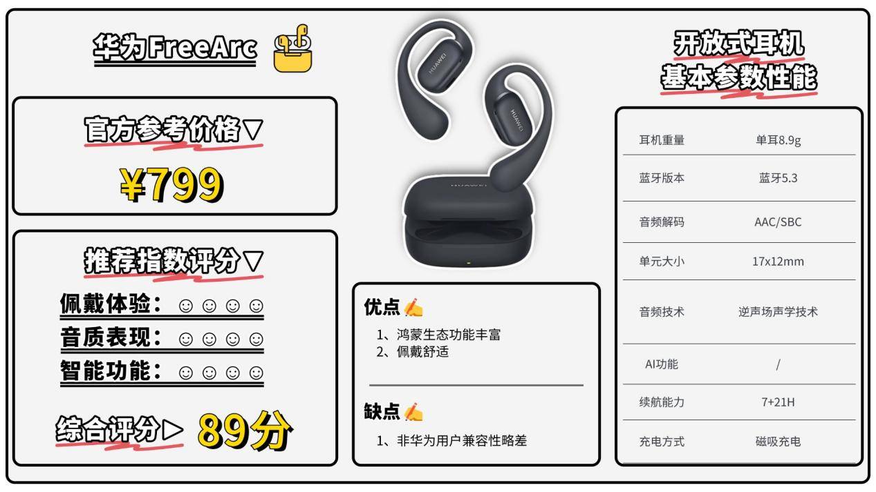 在音质表现上,华为Free ARC耳机配备13.4mm镀钛动圈单元,并设计了双调音孔,从理论上能够优化声场效果。不过实际听感较为平稳,高频清晰度中等,解析力保持在普通水平,低频略显单薄。整体声音适合日常听音需求,例如通勤、居家背景音乐等场景,对于不追求高保真体验的用户,也能满足基本听觉需求。