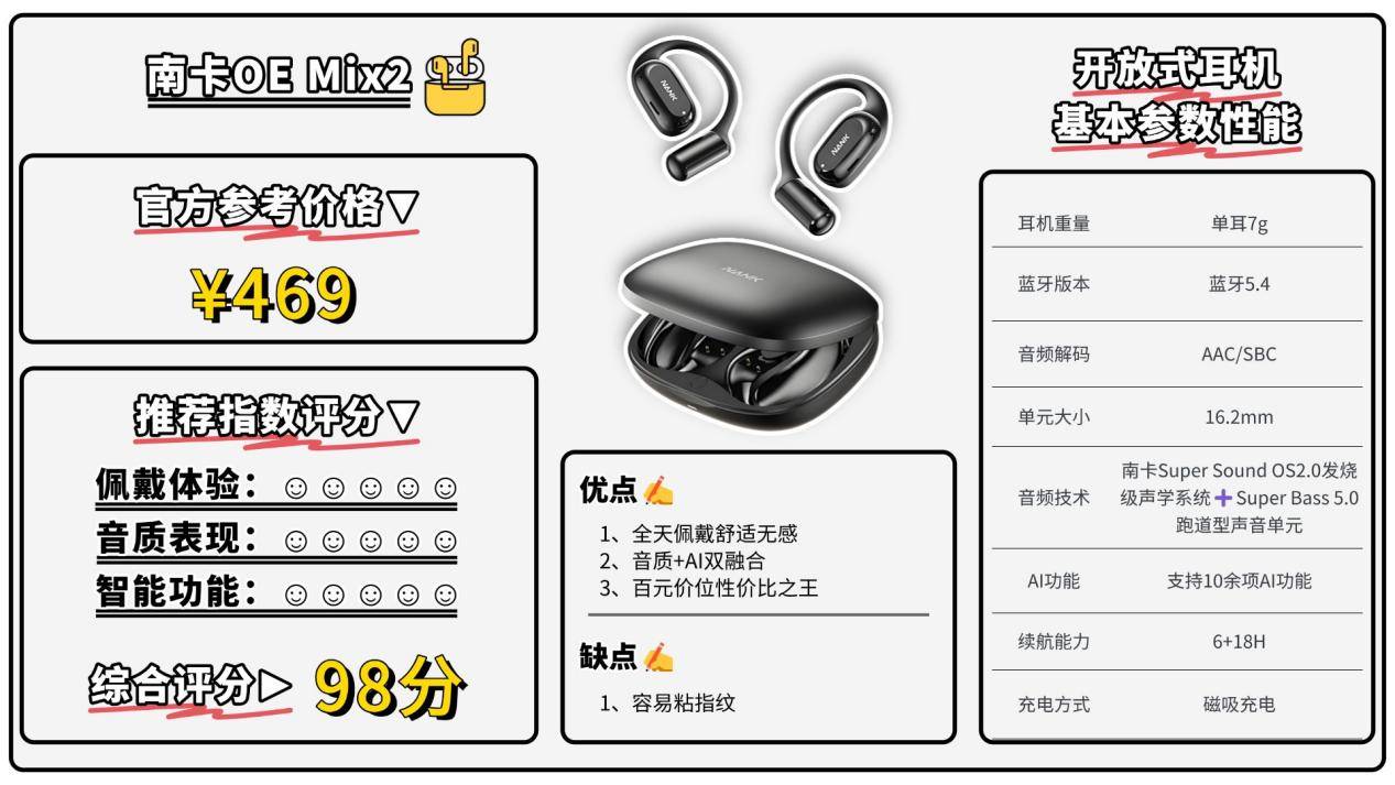 性能方面,OE Mix2搭载高定制蓝牙5.4芯片SOC,具备更快连接、更强抗干扰、更高传输速率及更低能耗,同时延迟控制表现出色。续航支持6+24小时,配备双麦ENC通话降噪、AI智能语音助手及IPX5防水能力,如此全能配置,即便放在千元档耳机中,也属难得的高规格之作,充分展现南卡的技术诚意与硬核实力。