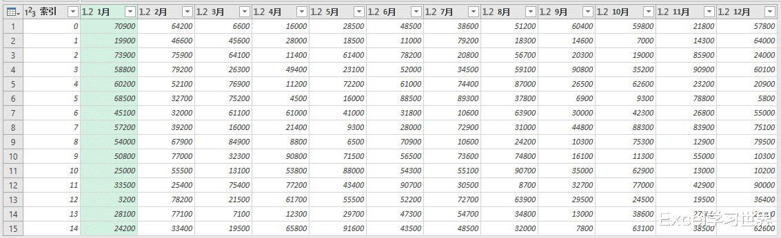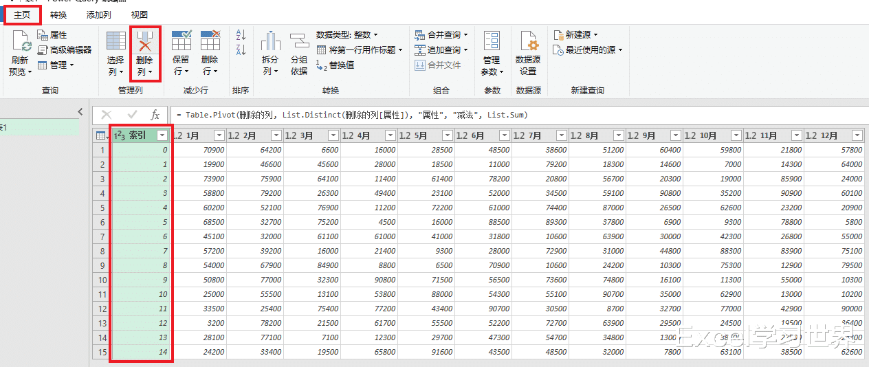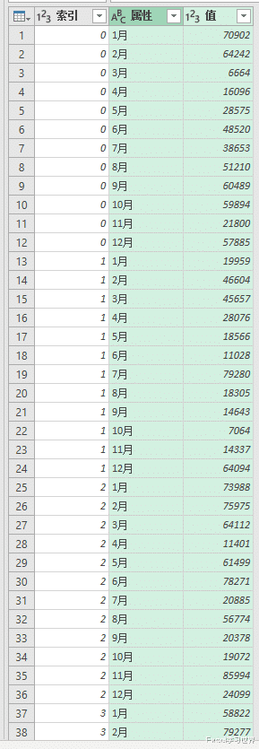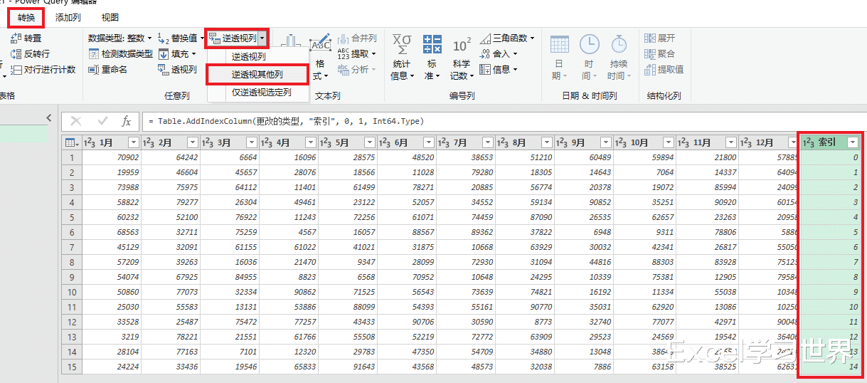 4. 选中“索引”列 --> 选择任务栏的“转换”-->“逆透视”-->“逆透视其他列”
