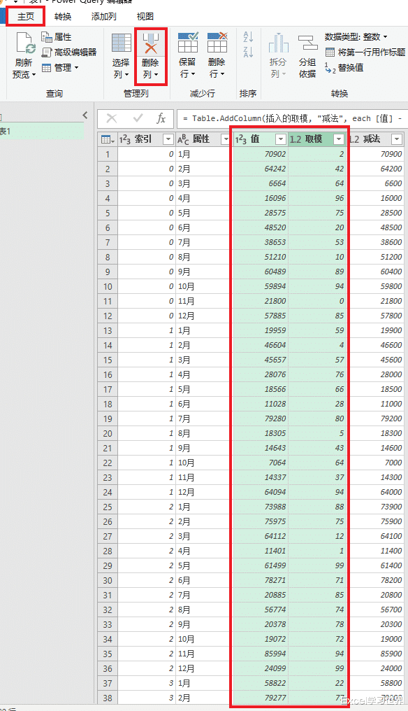 5. 选中“值”列 --> 选择任务栏的“添加列”-->“标准”-->“取模”