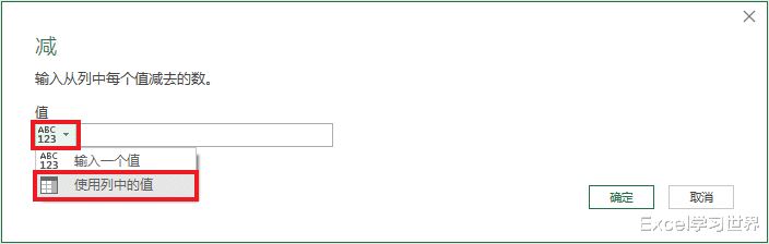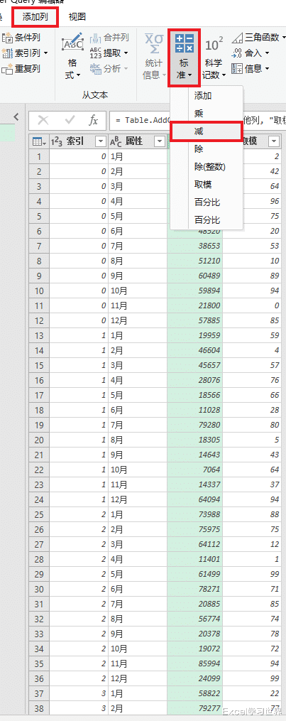 7. 再次选中“值”列 --> 选择“添加列”-->“标准”-->“减”