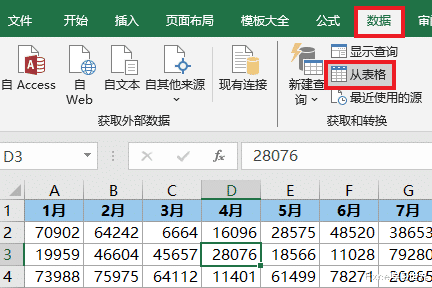 1. 选中左侧数据表的任意单元格 --> 选择任务栏的“数据”-->“从表格”