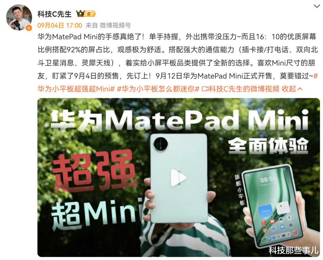 有科技博主在评测后表示,“华为MatePad Mini的手感真绝了!单手持握,外出携带也没压力,而且16:10的优质屏幕比例搭配92%的高屏占比,观感极为舒适。搭配强大的通信能力,应用灵犀通信技术,不仅支持插卡接打电话,还支持双向北斗卫星消息,着实给小屏平板品类提供了全新的选择”。