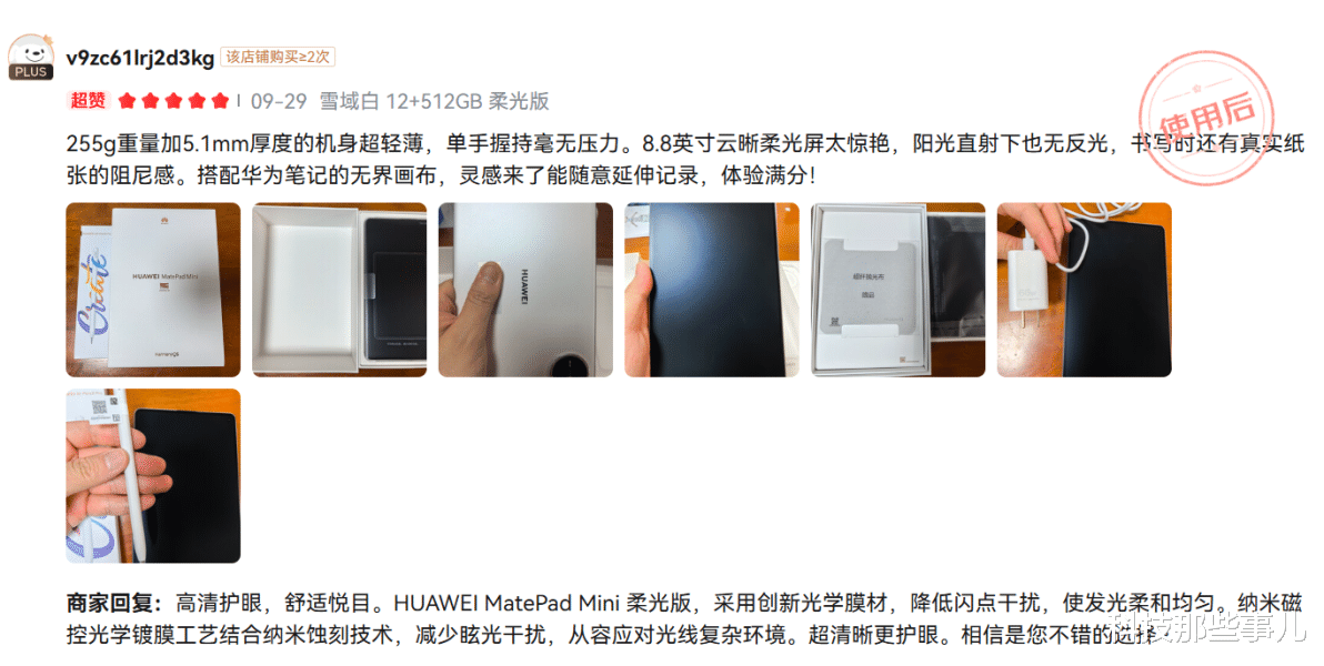 在电商平台上,也有用户分享说,“255g重量加5.1mm厚度的机身超轻薄,单手握持毫无压力。8.8英寸柔性OLED云晰柔光屏太惊艳,阳光直射下屏幕依旧清晰,书写时还有类似真实纸张的阻尼感。搭配华为笔记的无界画布,灵感来了能随意延伸记录,体验满分!”