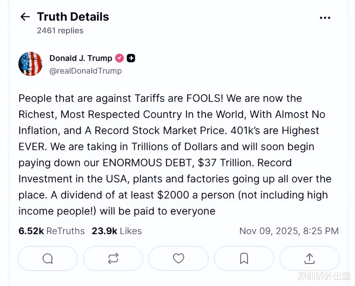 特朗普写道:“每人(不包括高收入者)至少将获得2000美元的红利。”他批评反对关税政策者为“傻瓜”,并宣称美国正成为“世界上最富有、最受尊重的国家”。