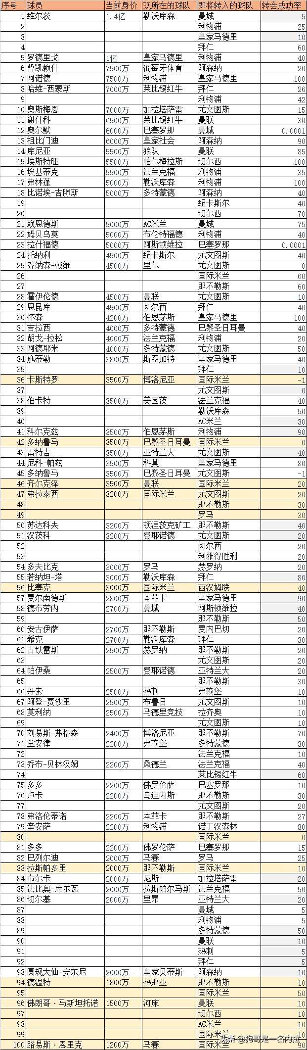 最后,狗哥罗列了一些主要的转会传闻数据(主要是身价大于2000W、与豪门相关的转会),其中转会成功率为狗哥个人主观推测,仅供参考,切莫当真。