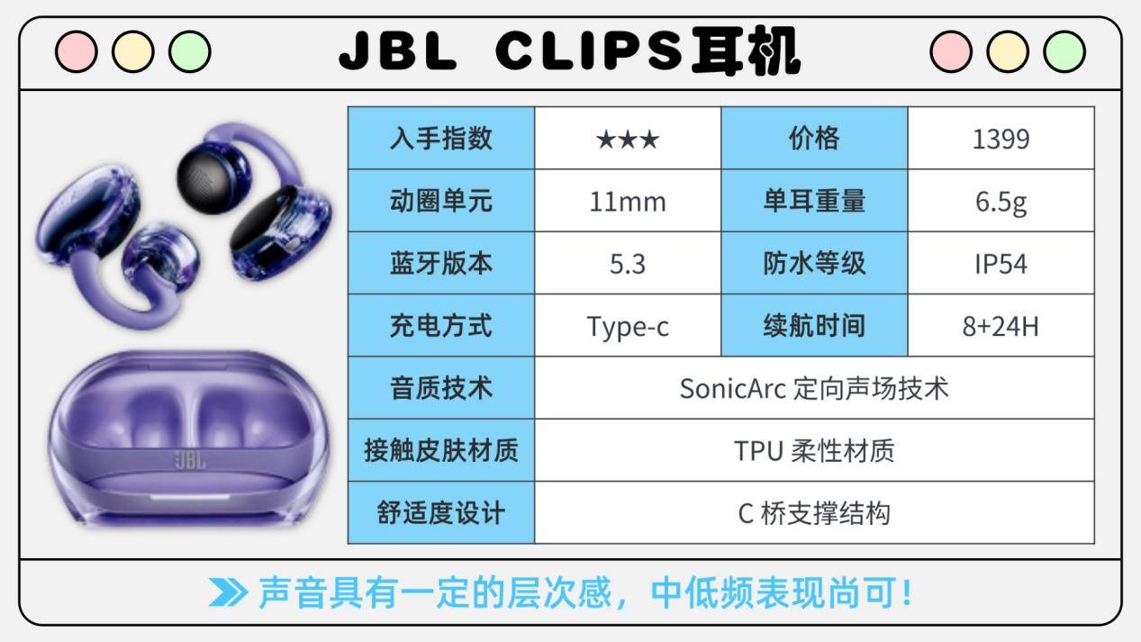 佩戴方面,CLIPS主打轻量化,但耳夹偏硬,延展性一般,初次戴可能会感觉夹力比较明显。短时间使用问题不大,但长时间佩戴会在耳廓产生一定压迫感,尤其是耳朵偏小的人会更明显。不过稳固性还是不错的,跑步、跳绳或高强度训练时基本不易滑落。蓝牙部分搭载5.3芯片,连接速度快且基础稳定性良好,日常通勤或室内使用几乎不会卡顿。但在地铁或商场等干扰较多的环境中,抗干扰能力一般,偶尔会出现短暂延迟或掉速。总体来看,JBL CLIPS是一款外观抢眼、佩戴稳固的夹耳式耳机,适合听歌、运动及日常使用。