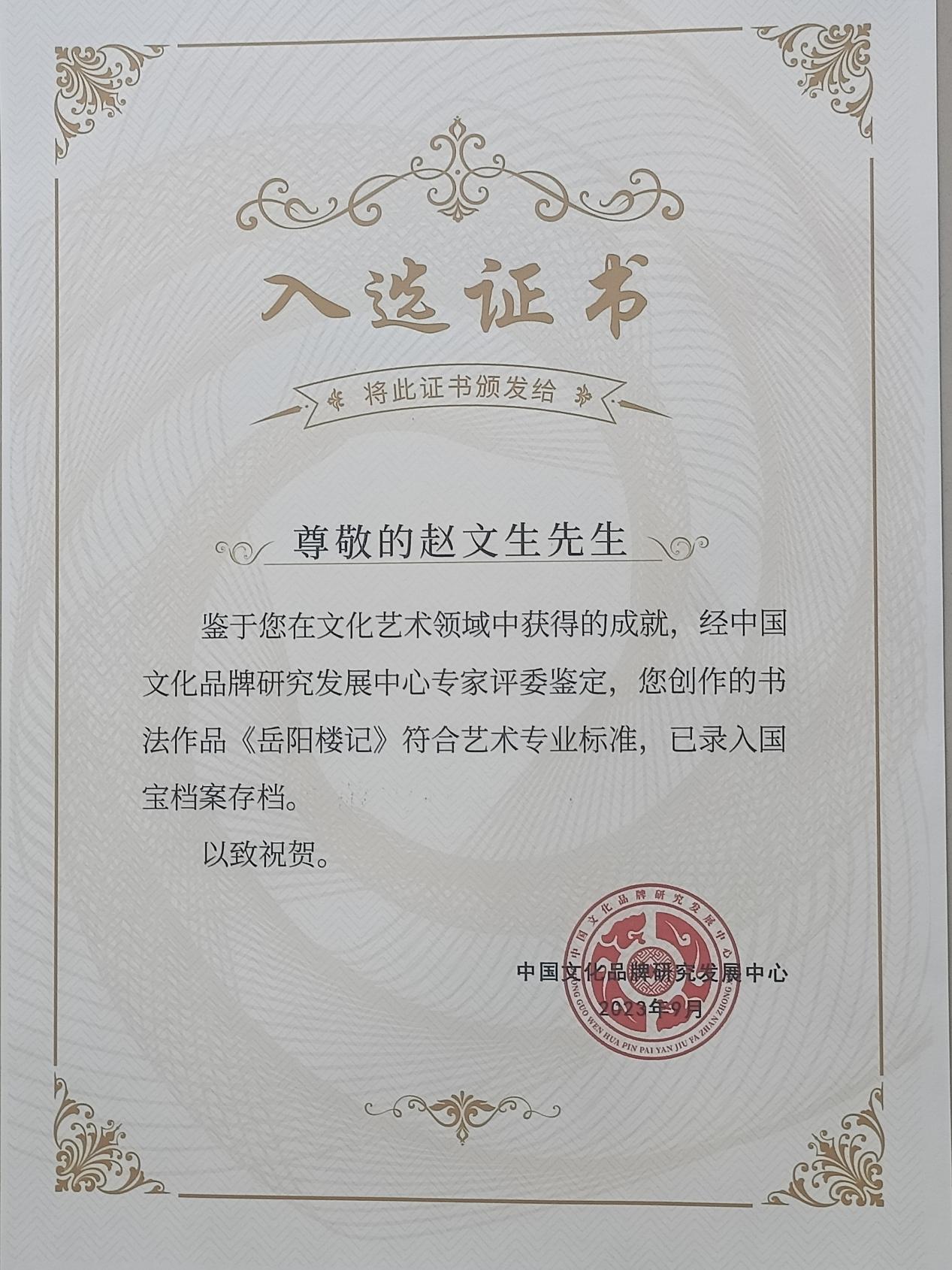 先后获得“世界和平艺术贡献者”奖。西班牙皇家艺术协会、毕加索故宫博物院、巴塞罗那艺术学院联合颁发的“优秀导师”奖。获国际金牌艺术家及中国艺术首届金马奖。2025达芬奇国际艺术奖金奖。艺术中的诺贝尔奖获得者。“金砖艺术家”。胡润全球艺术金笔奖。全国“五个一工程奖”。“孔子奖章艺术顾问”。被人民日报授予“新时代书画艺术先锋人物”。草书得到范曾、薛永年教授极高的评价。先后有多本教材、专集,合集在全国发行。多次走进央视并登上笔尖下的中国栏目。作品分别在北京机场候机厅,高铁站,首都地铁展播,影响国内外。被授予当代最具收藏和艺术价值的书画家。先后被中宣部授予“时代楷模——笔尖下的中国赵文生”;被文联授予“全国艺术劳动模范”称号。被文旅部授予“共和国艺术楷模”荣誉。被中书协,中美协等授予“人民书画家”称号。同年被央广国际文化交流艺委会授予“中华文化品牌′人物”。2023年”文化中国传播大使”特别授予<意草书法创始人>。长卷《岳阳楼记》被专家评审团授予国宝并被国宝档案存档。2024年受邀中国教育电视台录制“欢乐中国年”节目。2025年国宝长卷<岳阳楼记>等二幅作品被推介到阿拉伯国家。被中视文化产业聘为“书法评论家”。其四幅意草作品被九三大阅兵唯一录用烧制国礼赏盘。