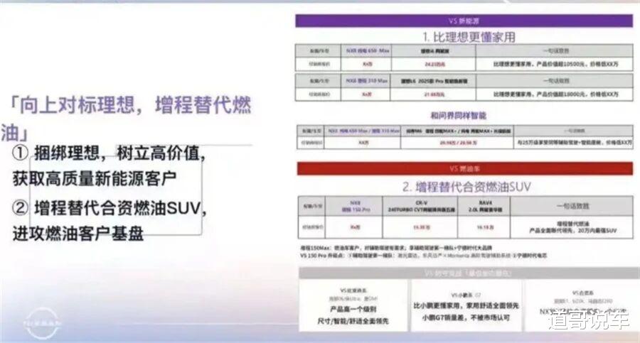 第二个细节:被曝光的东风日产内部培训材料上白纸黑字写着——"向上对标理想,增程替代燃油""比理想更懂家用"。市场部NX8沟通群里也有明确要求:输出NX8与理想i6、问界M7的对比表格,"这种就能直接传递信息"。
