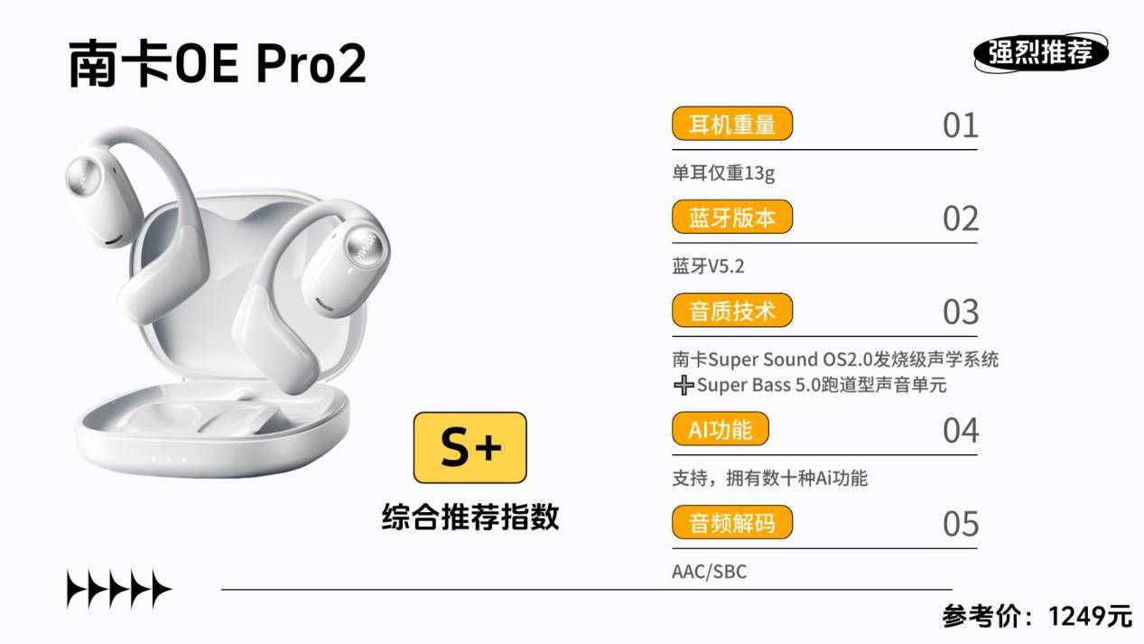 作为国内开放式耳机TOP1品牌,南卡OE Pro2获得权威机构认证与千余位HiFi发烧友的一致好评,在音质与舒适度上双双登顶,并多次获国内外媒体推荐。自上市以来凭借真实口碑持续热销,如今更融合全能智慧系统,集翻译、对话、创作等多场景体验于一身。凭借“全能智慧助手 + 音质巅峰”的双重优势,OE Pro2稳居行业旗舰标杆。